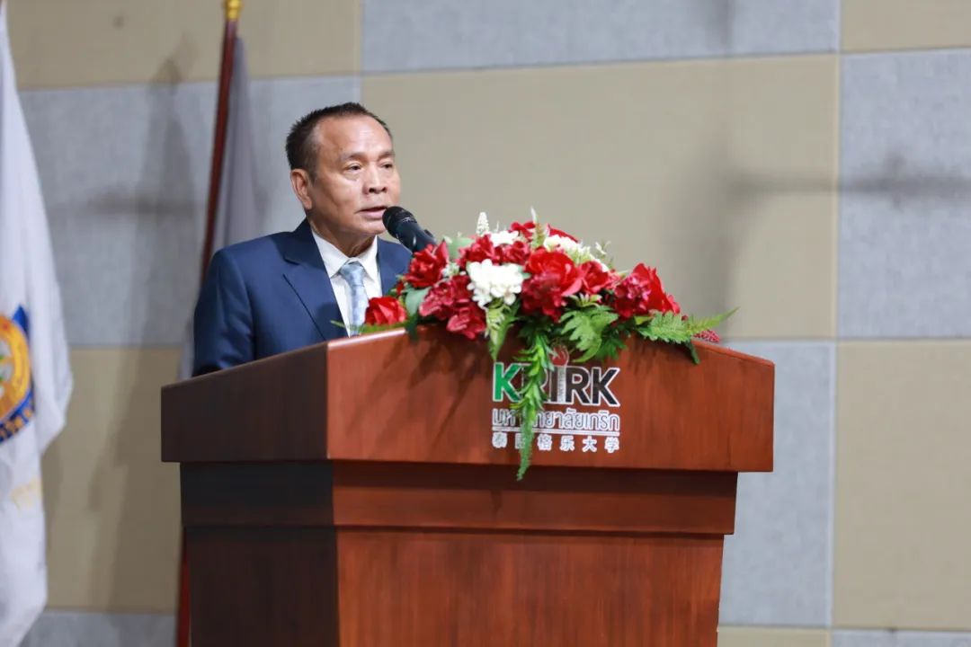 Aree Krainara 阁下既是泰国劳工部秘书长,同时也是格乐大学引以为傲的校友,登台致辞。他表示:"今日有幸参加母校73周年庆典,我倍感荣耀。作为政治传播学院政治学硕士课程校友,格乐大学不仅传授学术知识,更培养了我们深厚的道德修养、职业操守和批判性思维能力,为我的职业生涯奠定了坚实基础。这所培养出大批人力资源、持续为社会创造价值的一流学府,请允许我致以最诚挚的祝贺。"