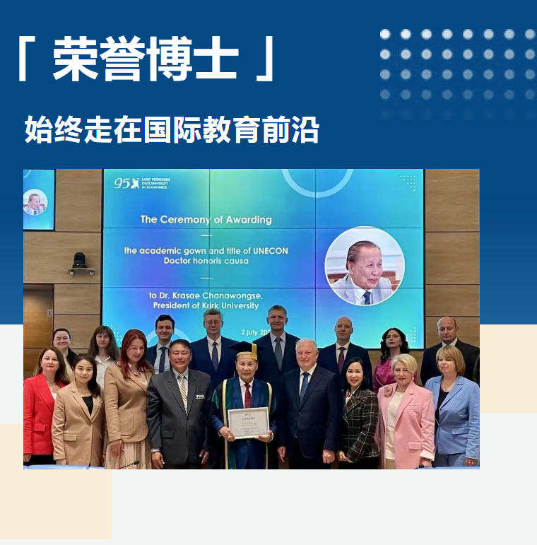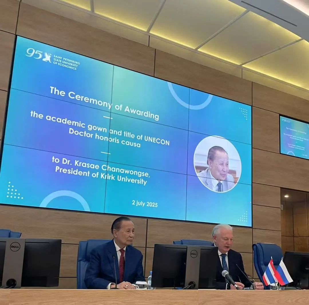 2025年7月2日,泰国外交部原部长、格乐大学杨金泉校长,荣获俄罗斯圣彼得堡国立经济大学荣誉博士。杨校长特赴俄罗斯圣彼得堡接受此荣誉博士殊荣。