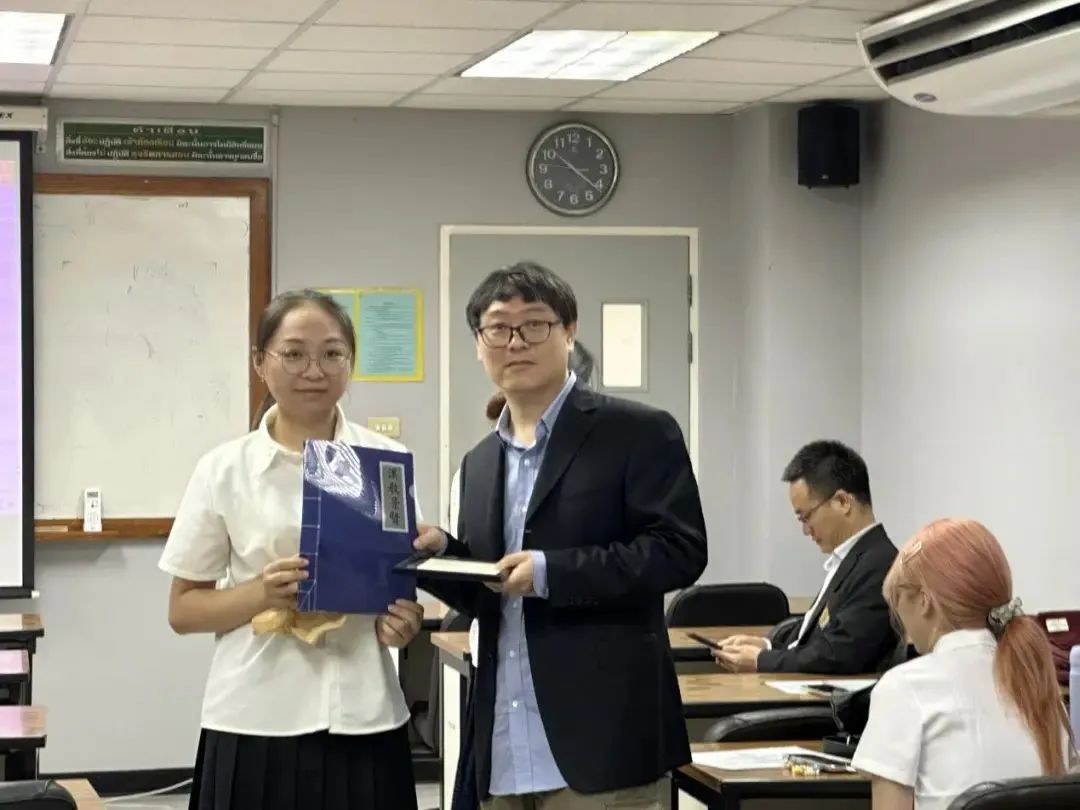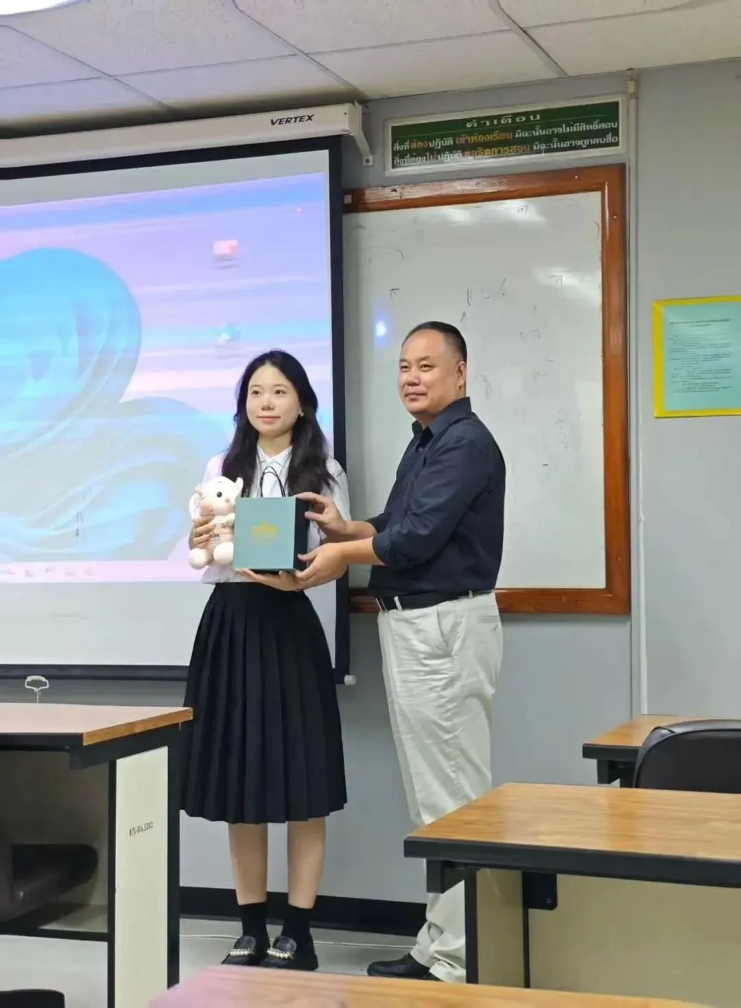 仪式尾声,浙江外国语学院学生代表向泰国格乐大学赠送了精心准备的纪念礼物,表达了浙外师生对格乐大学盛情接待与周密安排的诚挚谢意和美好祝愿,彰显了两校间深厚的情谊,也寄托着对持续深化文化交流的共同期待。