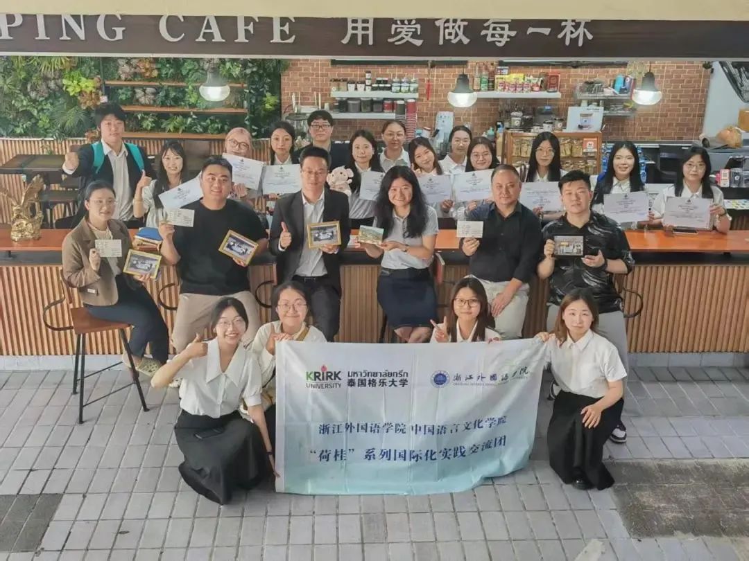 7月16日上午,泰国格乐大学中国国际语言文化学院为浙江外国语学院中文学院赴泰交流团隆重举行结业仪式,标志着为期两周的“荷桂”国际化小学期文化交流项目圆满结束。泰国格乐大学副校长、中国国际语言文化学院院长罗勇博士,对外汉语教学专业李学志主任等出席仪式。