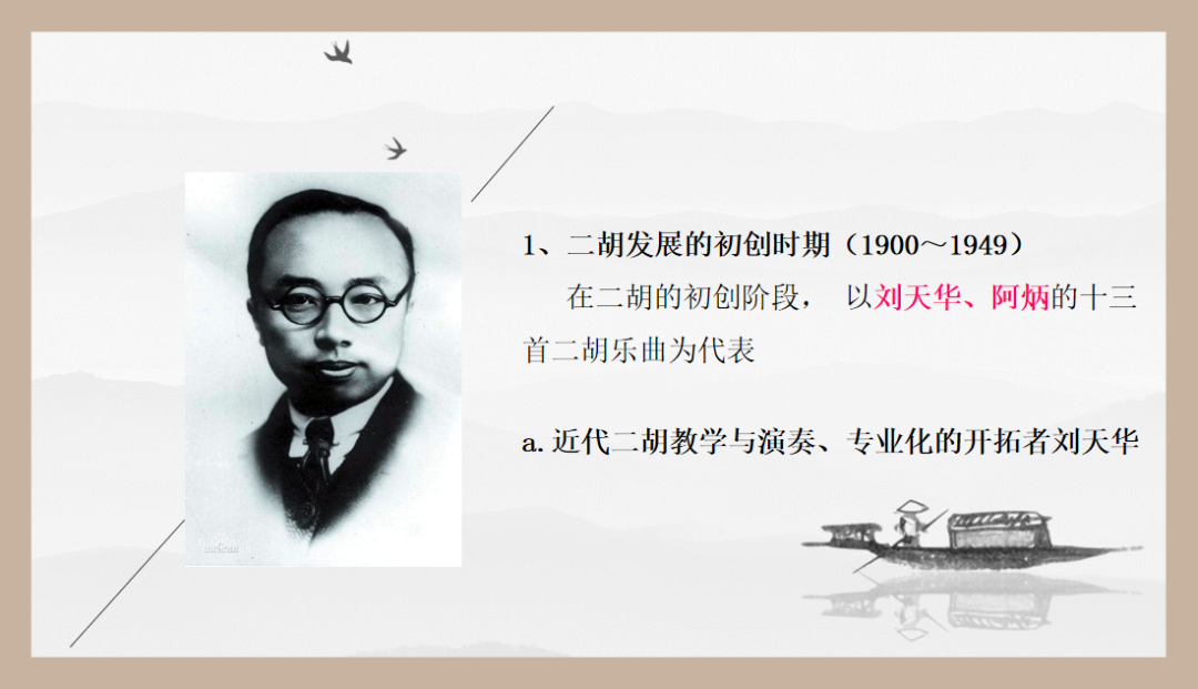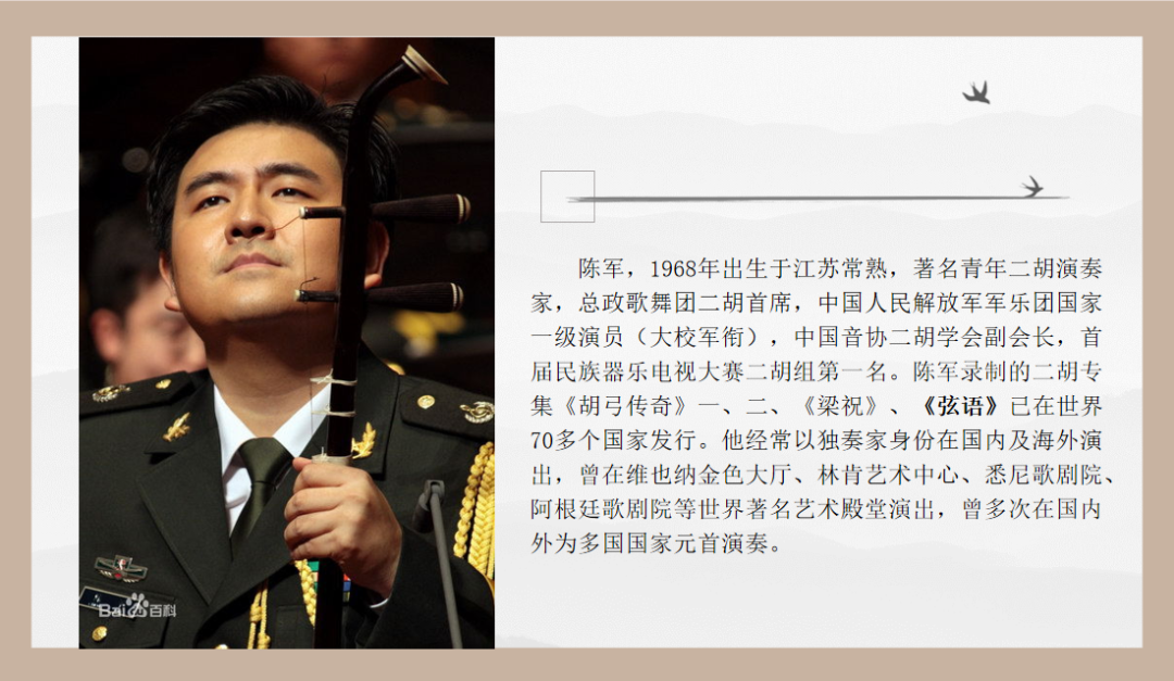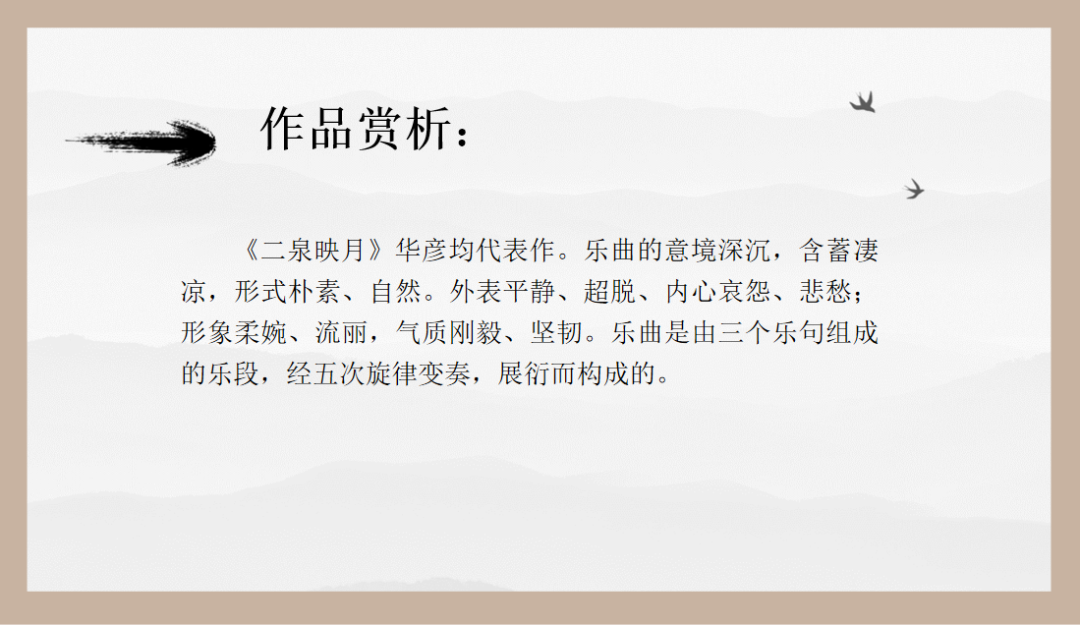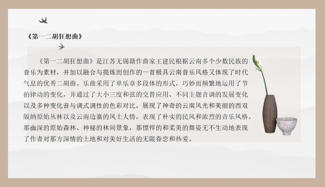 在讲座的内容里,王娟娟同学对二胡近百年不同时期的代表作品,各种乐器的代表人物和代表作,做了详细的讲解,结合作品赏析让大家对乐器及作品的创作有了更加深入的了解。比如大家熟知的《二泉映月》,是华彦均代表作。乐曲的意境深沉,含蓄凄凉,形式朴素、自然。外表平静、超脱、内心哀怨、悲愁;形象柔婉、流丽,气质刚毅、坚韧。乐曲是由三个乐句组成的乐段,经五次旋律变奏,展衍而构成的。