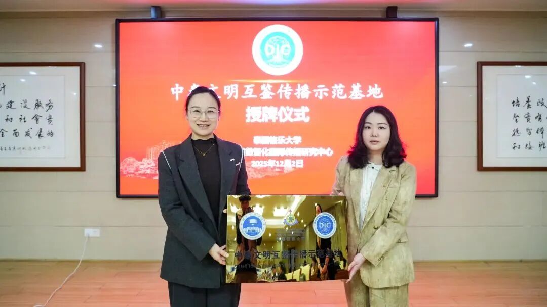 在合作推进环节,泰国格乐大学代表林东与湖南信息学院党委委员、校长助理、教务处处长刘汨凡共同为湖南省数智化国际传播研究中心授予“中泰文明互鉴传播示范基地”牌匾,并向中心主任艾艳红颁发客座教授聘书。此举标志着泰国格乐大学与湖南信息学院在国际化传播合作方面迈出实质性步伐,为中泰数字人文交流搭建了长效平台。