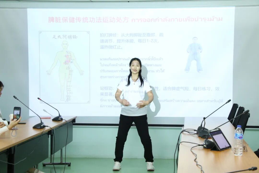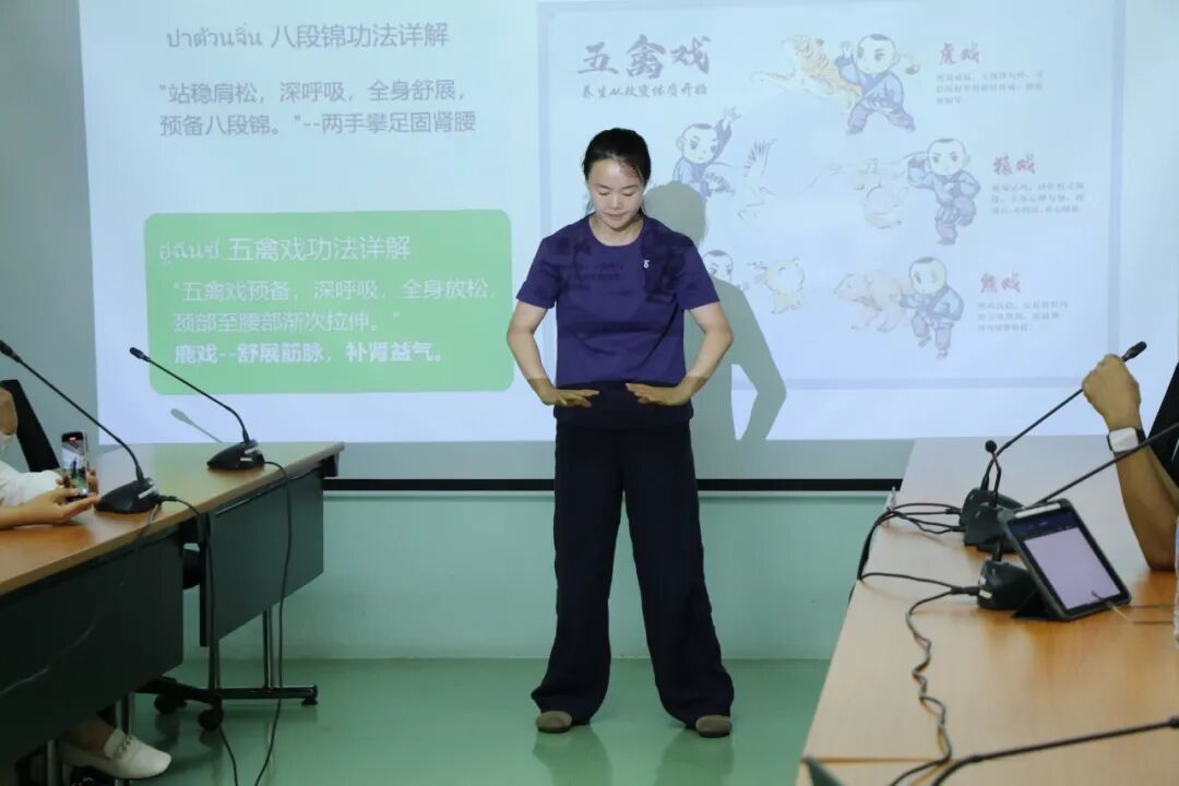王乐老师现场演示了五禽戏,其深厚的文化底蕴与显著的健身效果令在场泰方人员深感赞叹与兴奋。