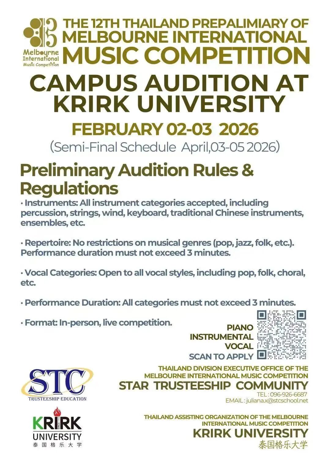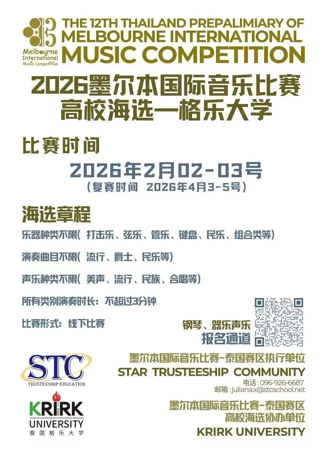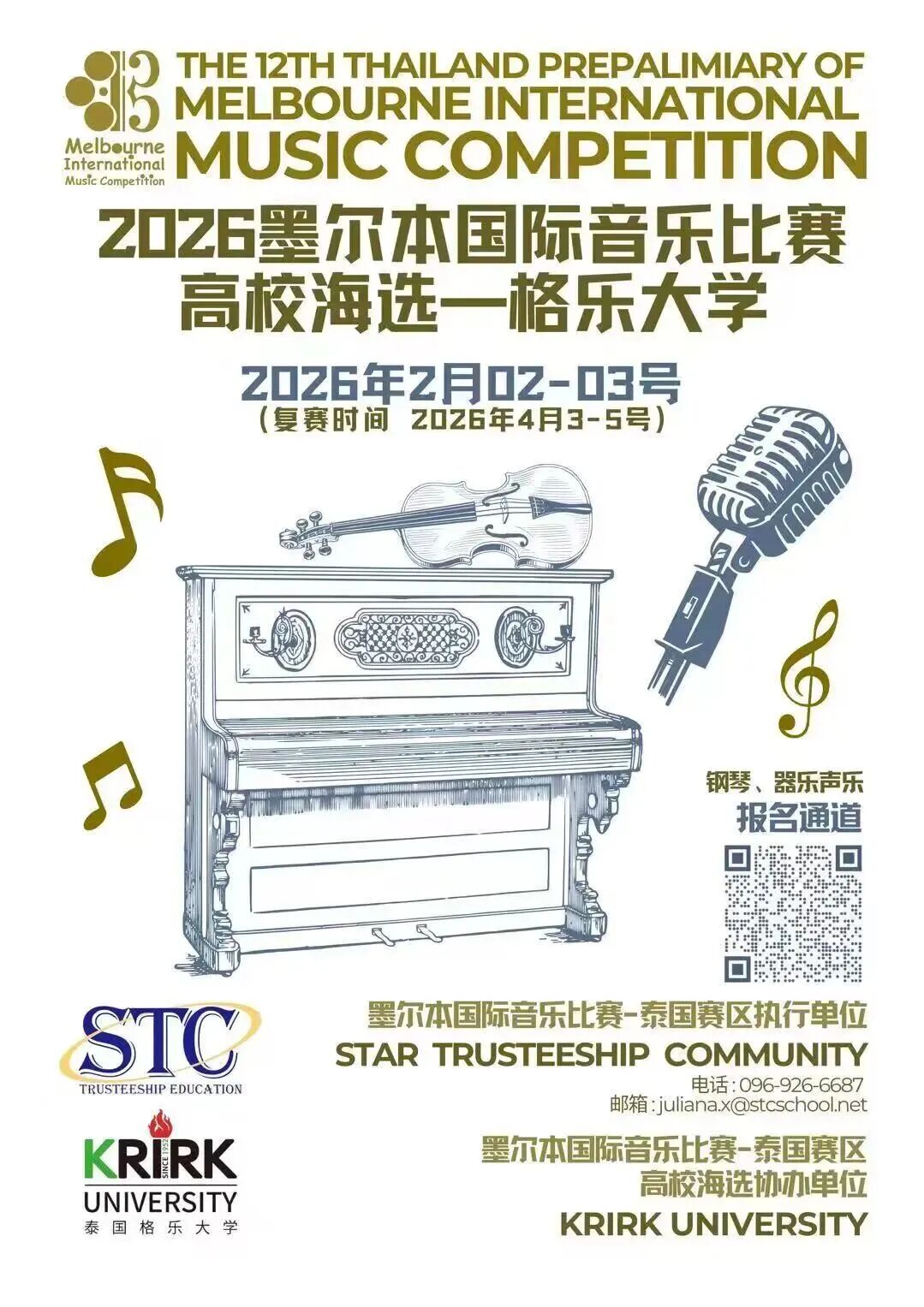 为进一步促进高校音乐艺术交流,搭建国际化音乐展示与交流平台,第十二届墨尔本国际音乐比赛(Melbourne International Music Competition,MIMC)泰国赛区高校海选将于2026年2月2日至3日在格乐大学(Krirk University)正式举行。本次赛事经墨尔本国际音乐比赛组委会正式授权,由格乐大学担任高校海选协办单位。现诚邀热爱音乐、勇于追梦的青年学子积极参与,在国际舞台上尽情展现艺术风采,奏响属于自己的高光乐章。